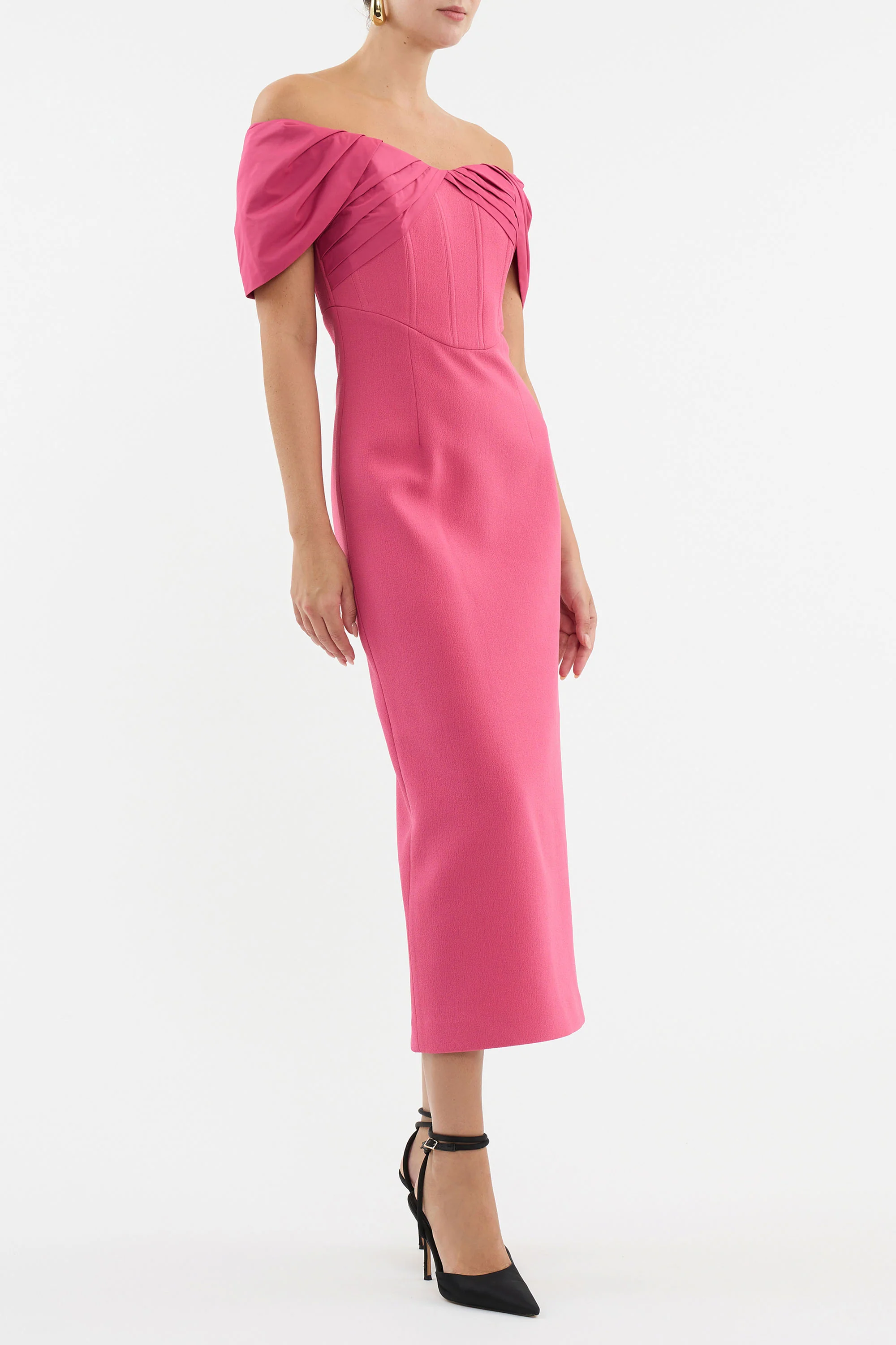 The Anais Off-Shoulder Midi Dress is a standout piece from our Bridal '24 capsule collection, 'Bella Rose'. This elegant dress combines bonded crepe with contrast taffeta, featuring an off-the-shoulder design that exudes timeless beauty. The fitted bodice, complete with boning, and cinched waist with a shaped waist seam create a flattering silhouette. The pencil skirt adds a touch of sophistication, and a back split offers ease of movement. A zip fastening at the back secures the dress, which is fully lined for comfort. ANAIS is a perfect choice for brides seeking a modern yet classic bridal look.
