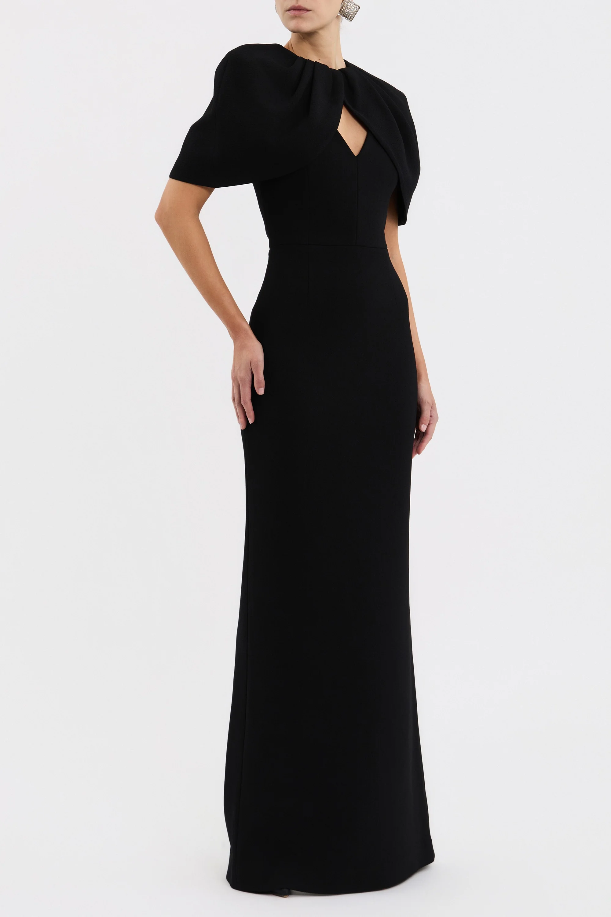 The Cameron Gown in black epitomises timeless elegance. Tailored from bonded crepe, it features a striking draped cape overlay that harmonises with the V neckline and fitted bodice, elevated by princess seams to flatter the figure. The column maxi skirt offers a sophisticated silhouette, detailed with a back split for ease of wear. Complete with lining and an invisible zip fastening at the back, this gown is designed to make a statement.