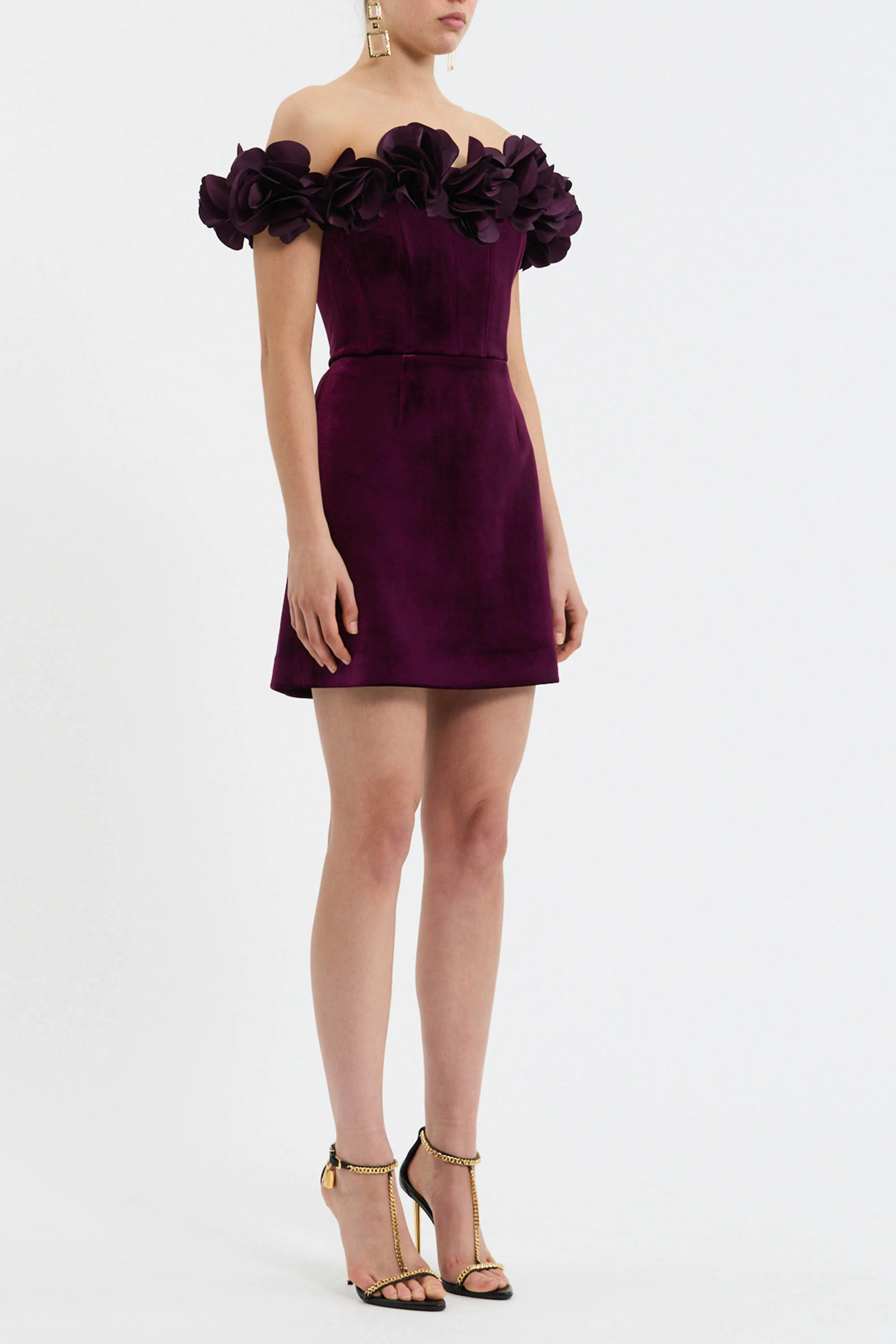 The Charles Mini Dress in blackberry is effortlessly chic, tailored from premium velvet. Its off the shoulder neckline is adorned with intricate floral applique, seamlessly blending with the fitted bodice reinforced with internal boning. Cinched at the waist, the A-line mini skirt creates an elegant silhouette, secured with an invisible zip fastening at the back. Fully lined for comfort, this dress is a versatile choice for your next special occasion.