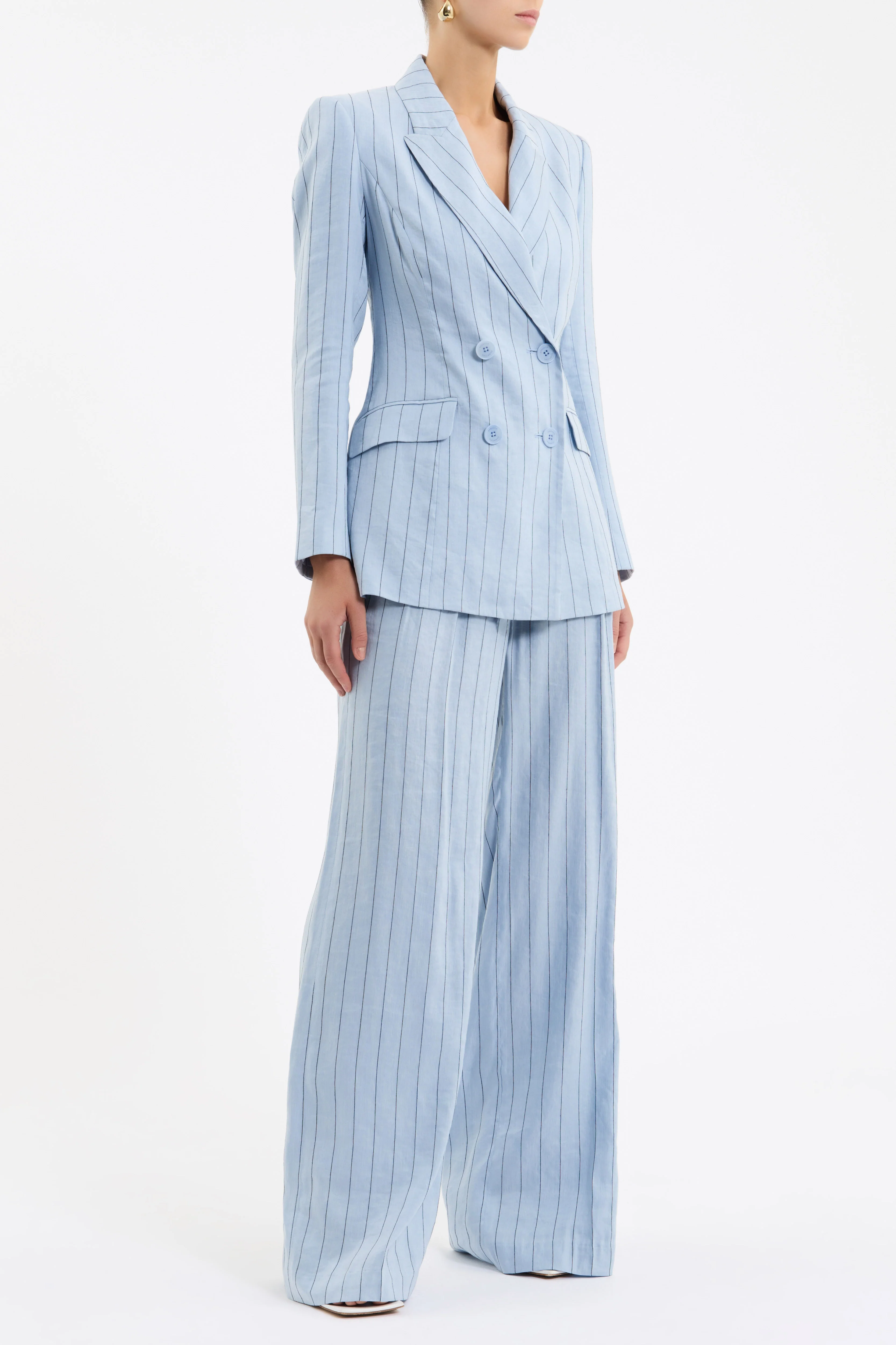 The Effie Pant combines timeless style with contemporary design in a pale blue pinstripe print. Featuring a tailored wide-leg silhouette, its high waistband with belt loops enhances its sophisticated look. Slanted front pockets and jet pockets at the back offer convenience, while a front fly zip fastening ensures ease of wear. Versatile in styling, these pants pair perfectly with our matching Effie Blazer.
