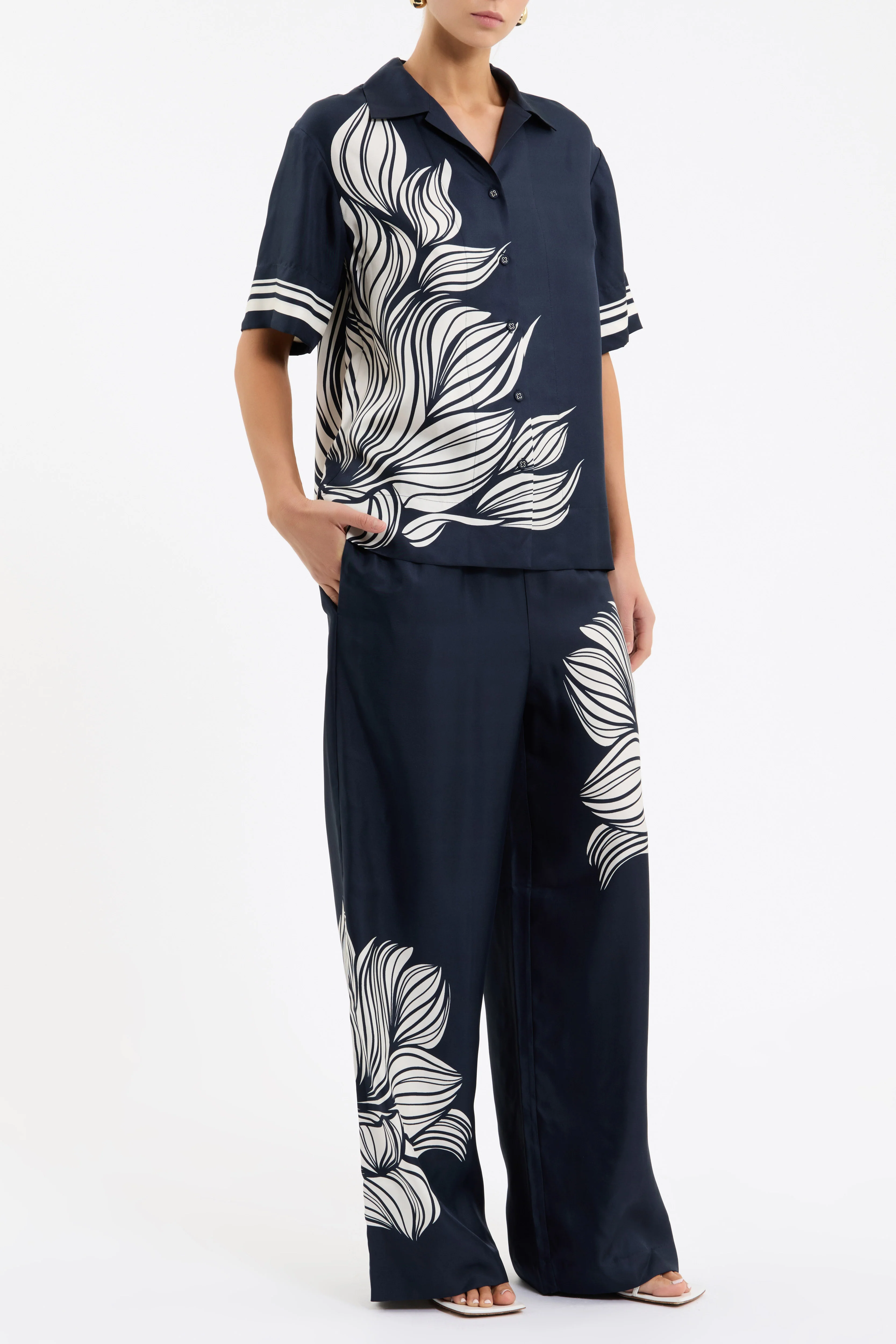 The Lalisa Pant is a versatile wardrobe staple, tailored from silk in a navy floral print. Its relaxed fit and wide-leg silhouette create a flattering shape, while the elasticated waistband and contrast draw cord provide effortless comfort and ease of wear. Chic and refined, these pants pair perfectly with the matching Lalisa Shirt.