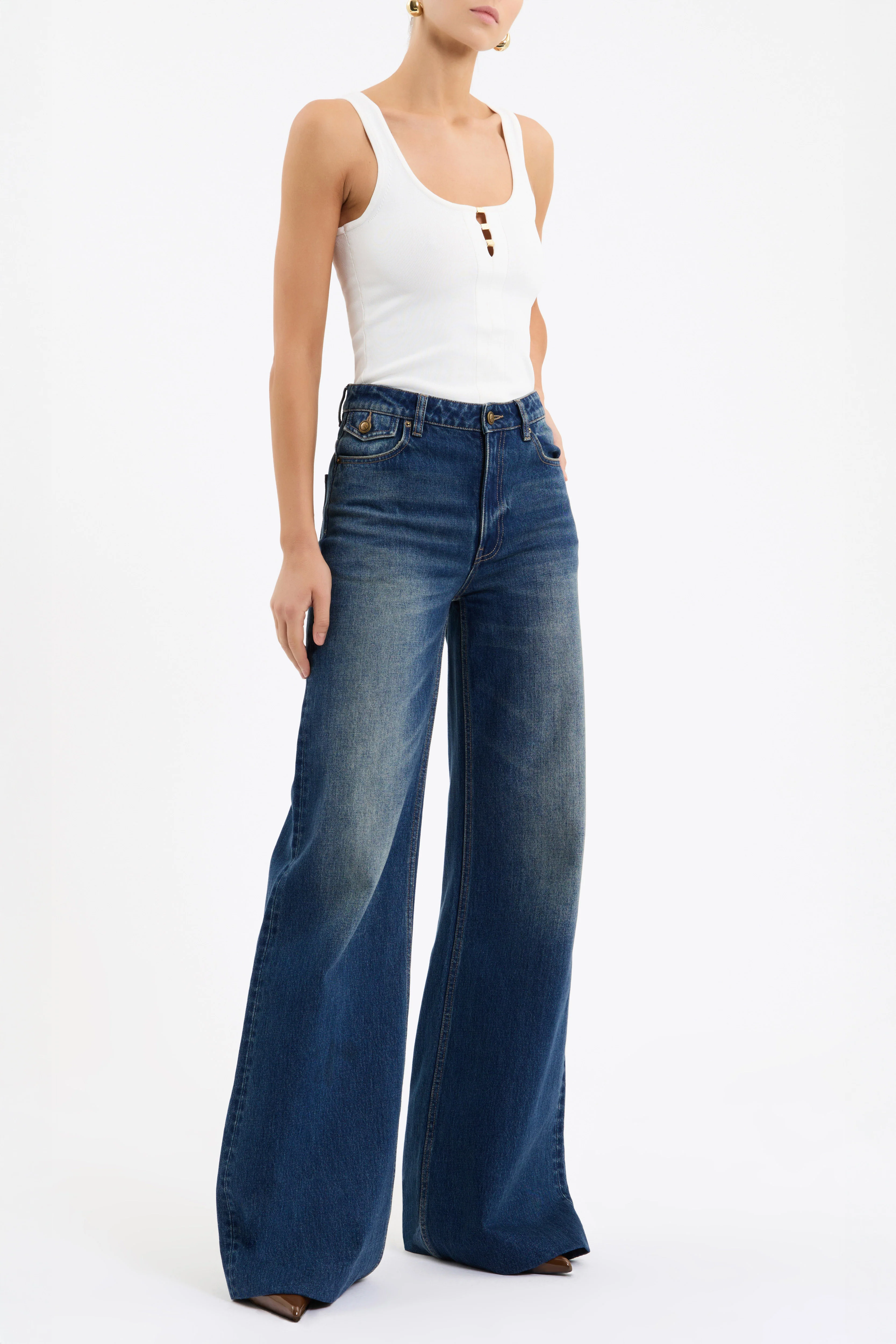 The Lorcan Top in ivory is a versatile wardrobe essential, tailored from single jersey. Its scoop neckline and fitted silhouette flatter the figure, supported by wide straps for comfort. Gold hardware details add a touch of refinement, while tubular binding at the neckline and armholes ensures effortless wear. Chic and polished, this top is perfect for day to night styling.