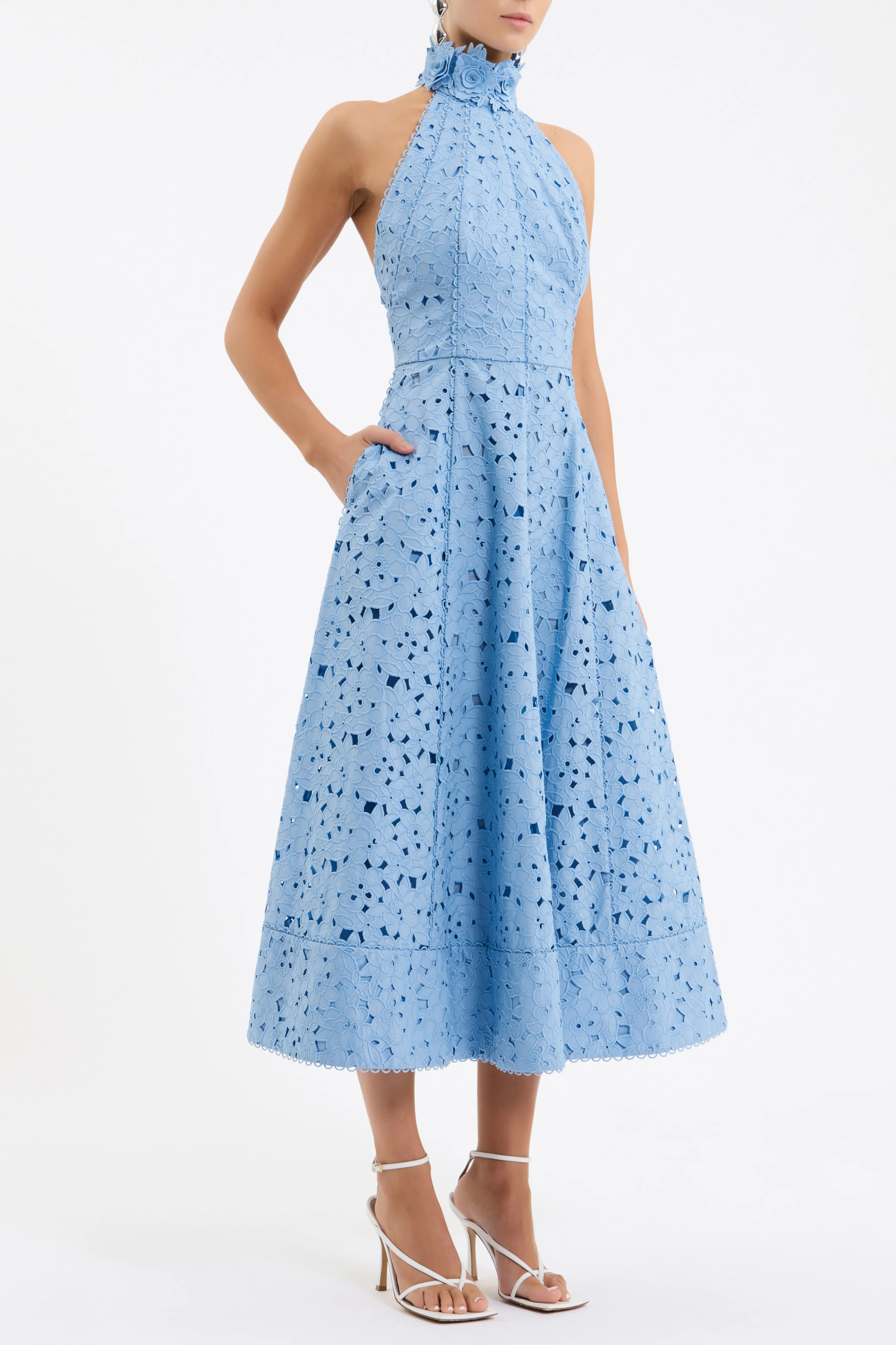 The Nuvola Halter Midi Dress in blue harmonises feminine elegance with timeless style, tailored from broderie anglaise. Featuring a halter neckline adorned with floral applique, its fitted bodice offers a refined shape, accentuated by a cinched waist to flatter the figure. The panelled circular midi skirt creates a graceful silhouette, secured with a zip fastening at the back for a precise fit. Fully lined, this dress seamlessly transitions from day to evening.